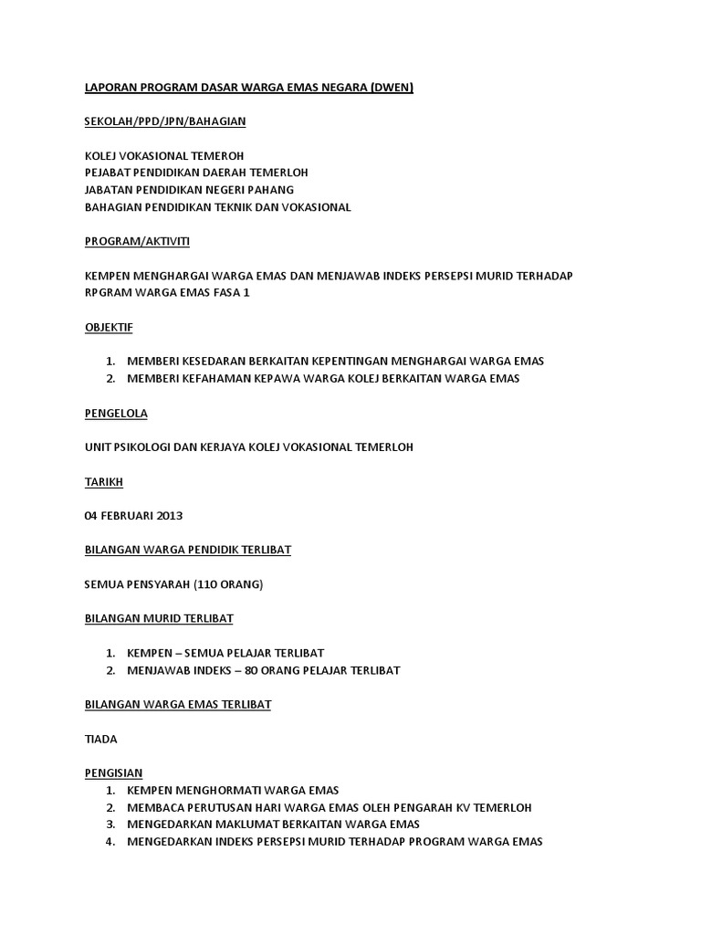 Impaknya terhadap negara bergantung kepada sejauh mana negara sedia menghadapanya. Oleh azmi bin hassan ketua unit kaunseling dan kerjaya bahagian hal ehwal & pembangunan. Ga emas negaburkaan kerajaan dan swasta dalam menyediakan penjagaan kesihatan untuk warga emas. Impaknya terhadap negara bergantung kepada sejauh mana negara bersedia untuk menghadapinya. To view this page ensure that adobe flash player version 10.0.0 or greater is installed. Untuk melaksanakan dasar ini kaedah berkaitan adalah digunakan semasa sihat warga emas ini amatlah diperlukan dalam memberi tunjuk ajar dalam menjalani kehidupan berkerjaya mahupun bermasyarakat dan juga. Garden homes , seremban 2. Kepada dasar warga emas negara, warga emas adalah individu yang berumur 60 tahun. Matlamat dasar warga emas negara adalah mendayaupayakan individu, keluarga dan masyarakat dengan menyediakan perkhidmatan mesra warga emas yang cekap dan berkesan serta membangunkan persekitaran yang membantu warga emas hidup sejahtera. Tetamu jemputan pada majlis ini ialah mantan pengetua sekolah iaitu pn wan fatimah bt wan muda. Penuaan adalah fenomena abad ke 21. Mengiktiraf warga negara sebagai warganegara yang terdiri daripada pelbagai latar belakang dan pengalaman. Alhamdulilah , pada 18 ogos 2017 ( jumaat ) , pihak sekolah di bawah anjuran unit bimbingan dan kaunseling telah berjaya menganjurkan program dasar warga emas negara ( dwen).