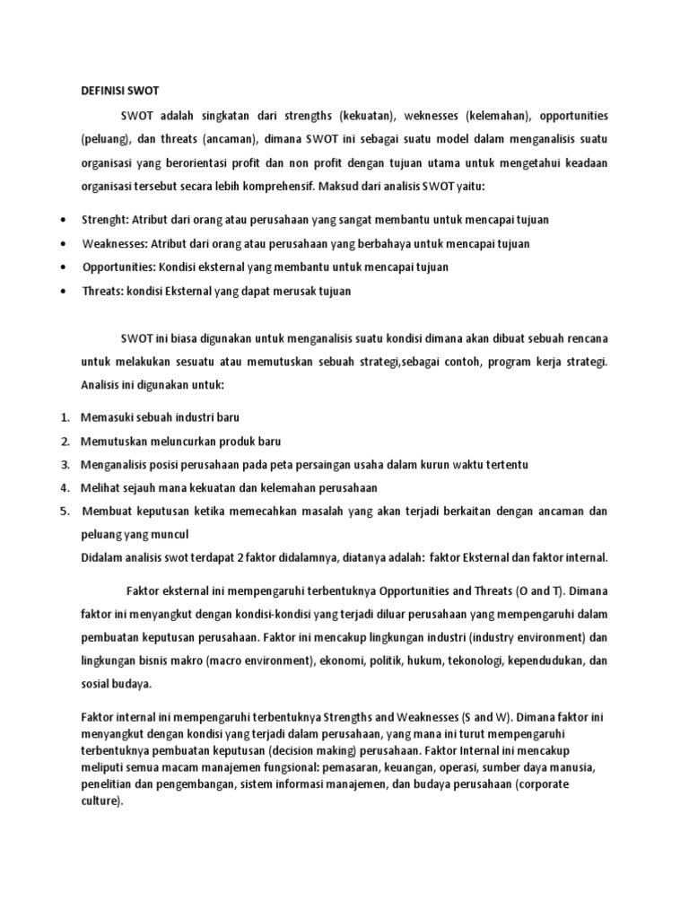 √ Analisis SWOT : Pengertian, Unsur, Manfaat, Faktor ... from seputarilmu.com Check spelling or type a new query. Maybe you would like to learn more about one of these? We did not find results for: