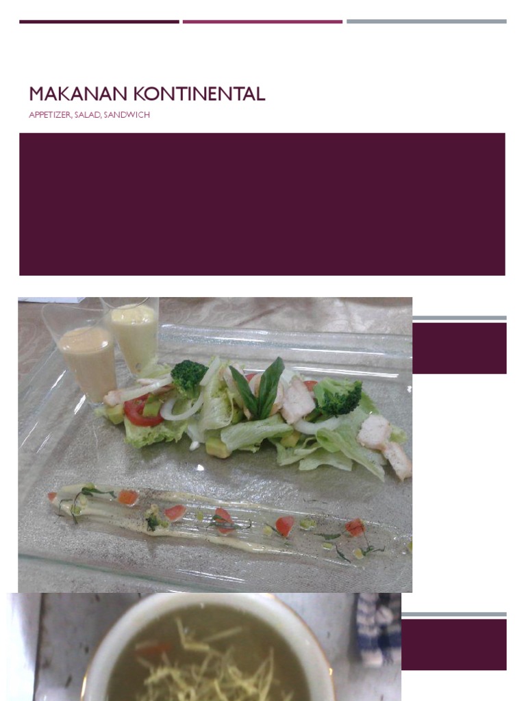 Akan tetapi, jika sebagai hidangan selingan atau pembuka karena sudah memiliki menu utama maka cukup berbahan sayuran dan dressing saja.